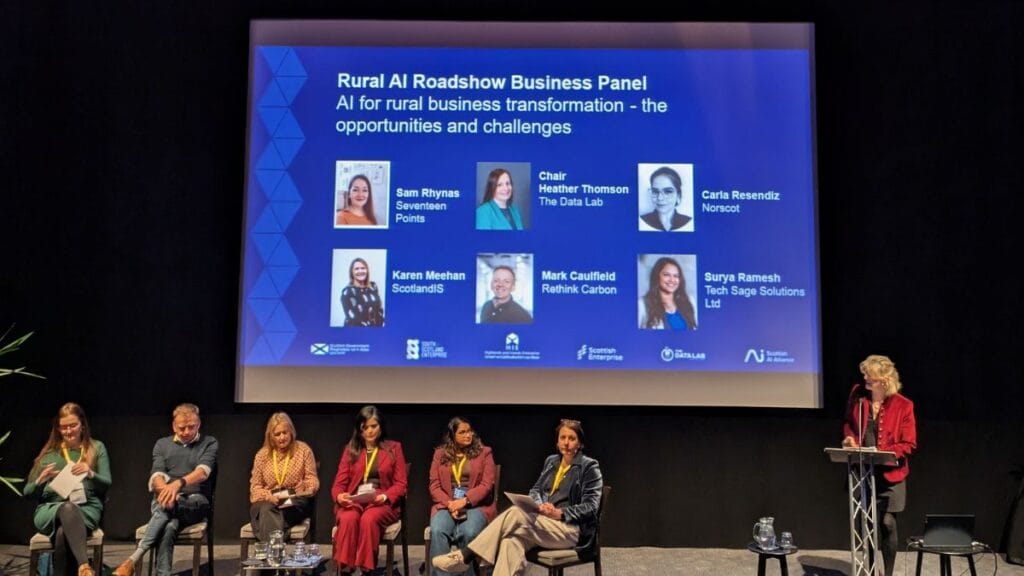 The roadshow was organised bythe Data Lab, with support from Highlands and Islands Enterprise, Skills Development Scotland, and the Scottish AI Alliance. Speakers included Chris Boyland from the Scottish Government, Heather Thompson (Chief Executive, the Data Lab), Carla Resendes Villasenor (Norscot Joinery), Karen Meekin (ScotlandIS), Sam Ryness (17 Points), Surya Ramesh (independent data consultant), and Robbie MacIsaac (Bellrock Technology).